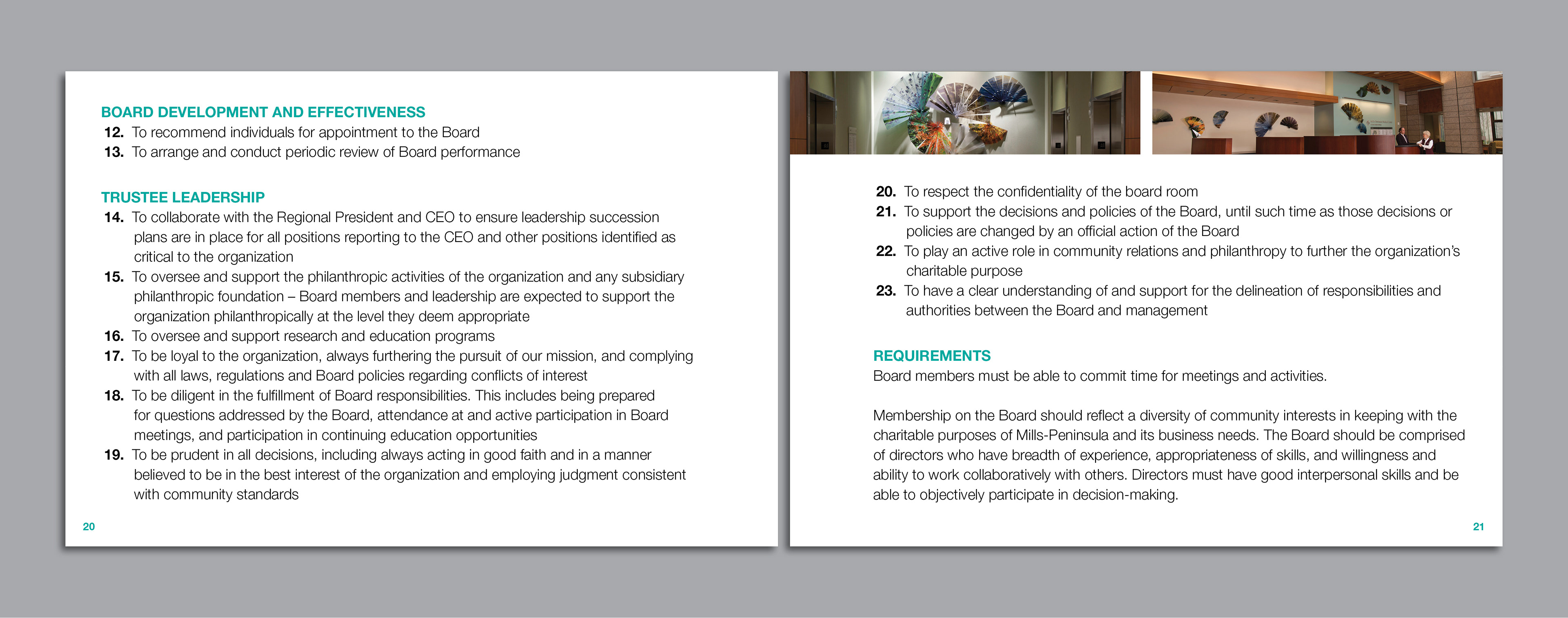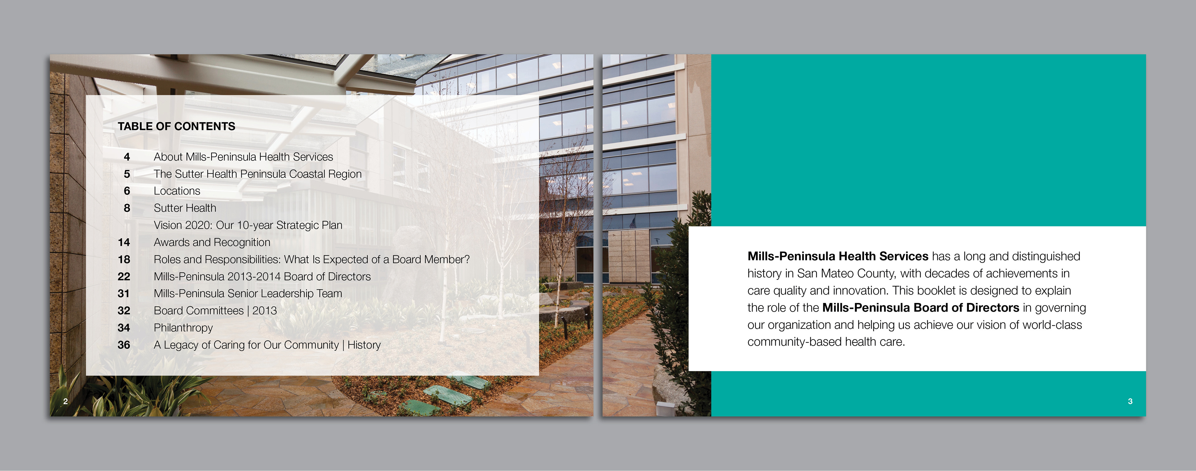 A 40-page booklet designed to recruit potential new members to the MPHS Board of Directors. It includes a brief history of the organization, information about its regional structure and affiliation to Sutter Health, board member roles and committee descriptions, philanthropy funding, and list of current board members and leadership team.