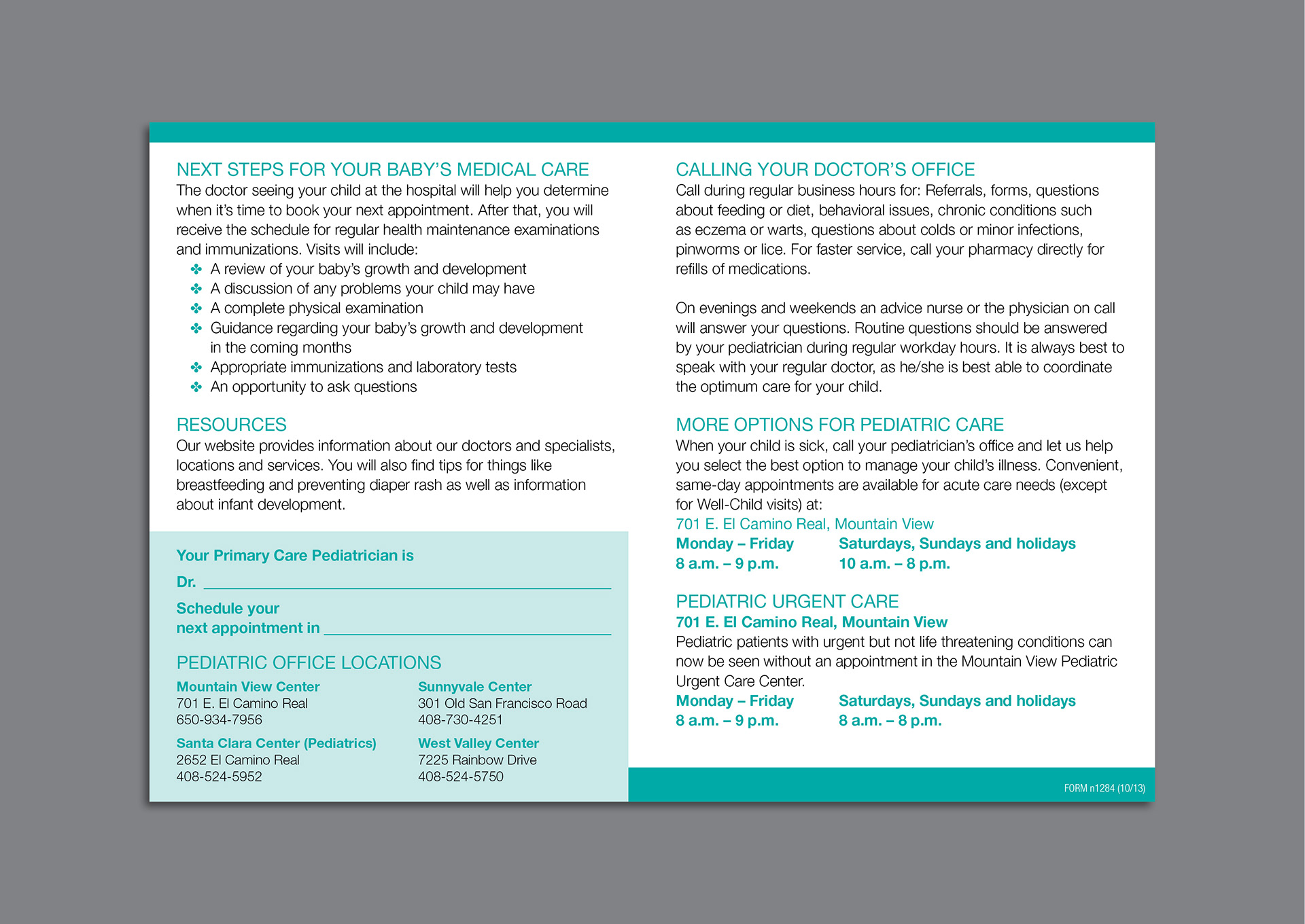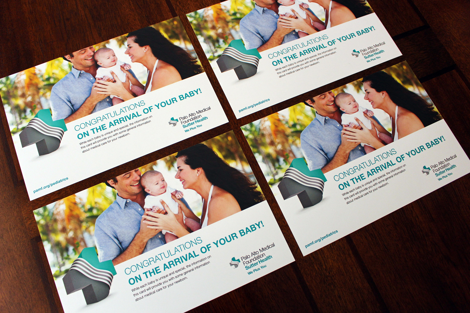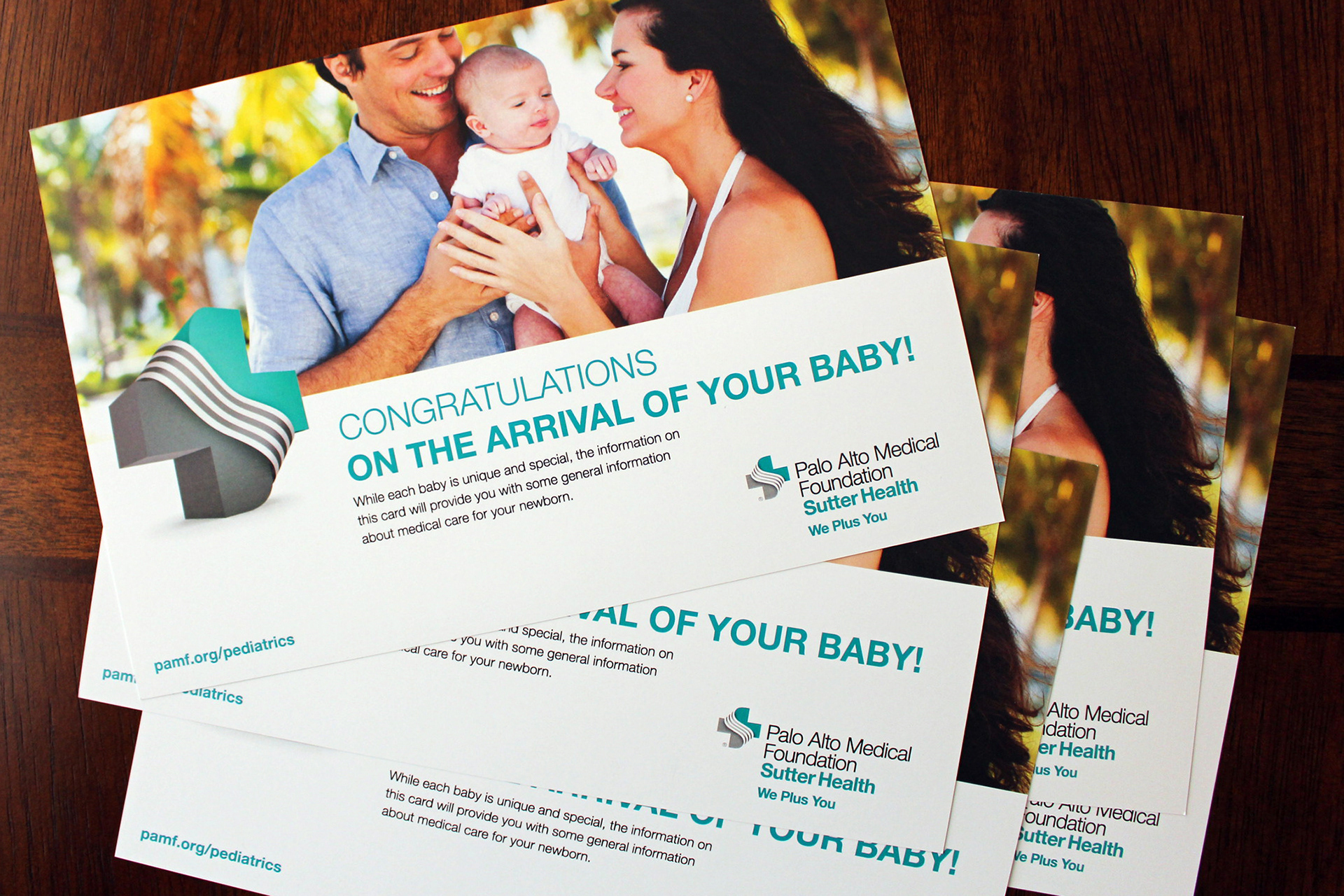 A congratulations card designed for newborn parents, it provides them with general information about medical care and resources for their new baby.