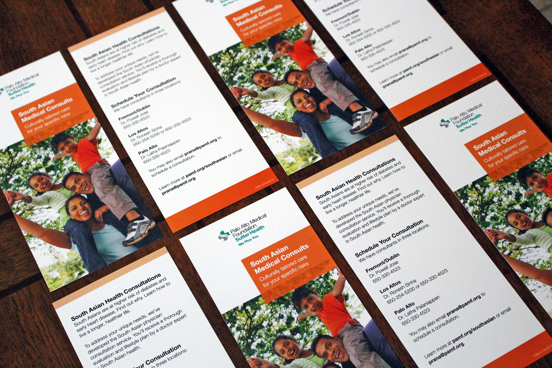 South Asian Health rack card redesigned to promote their medical consults, locations and website.