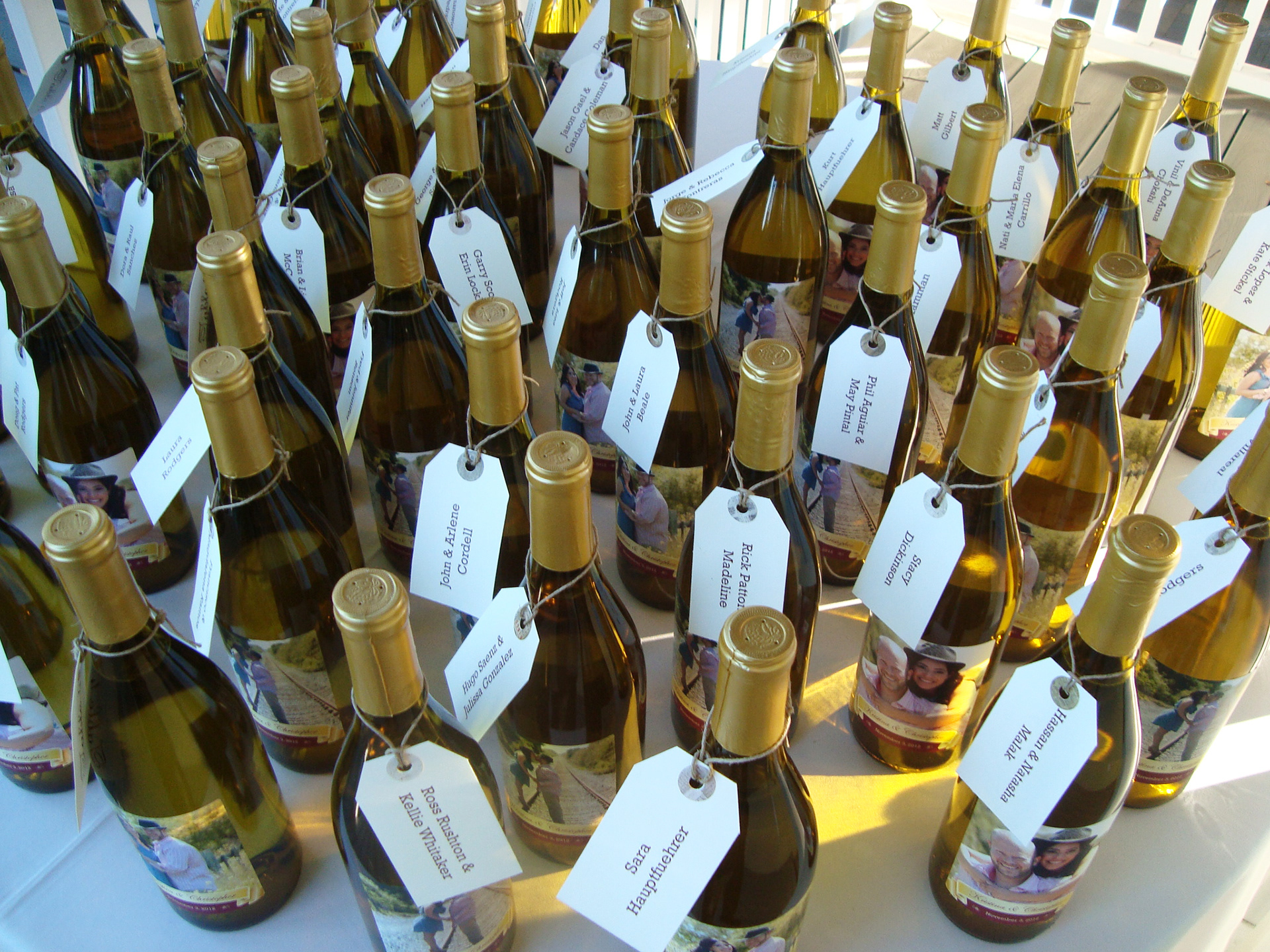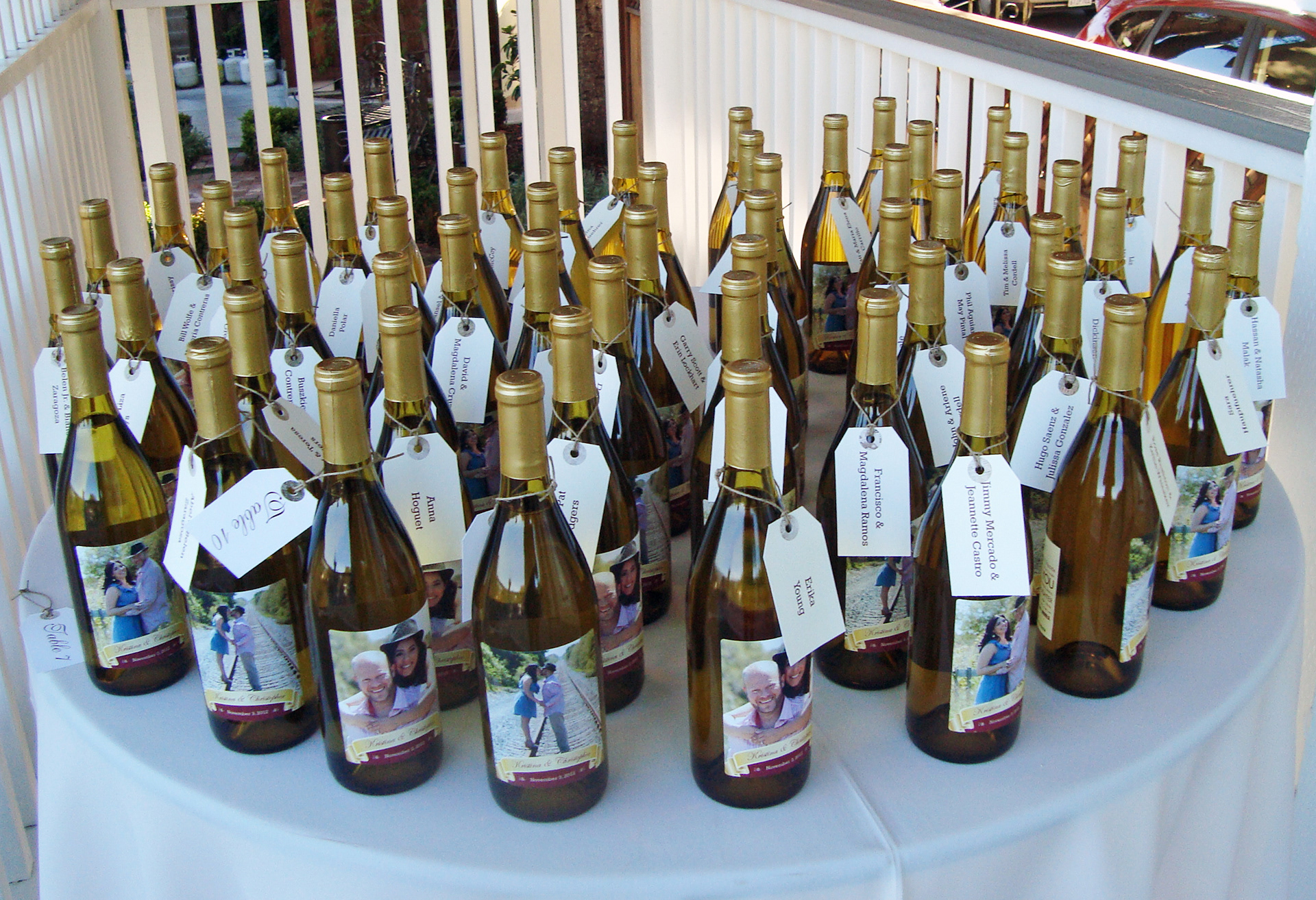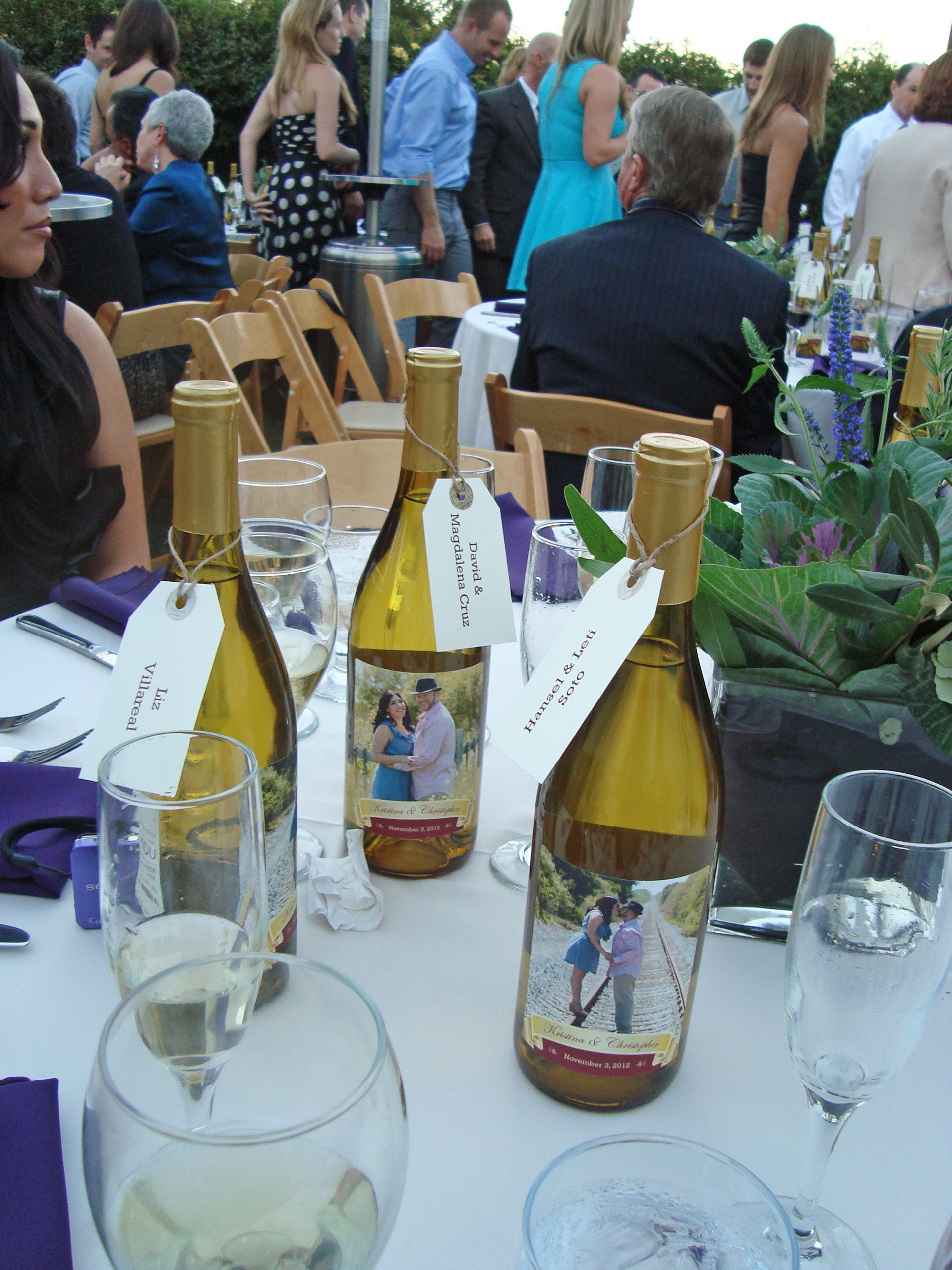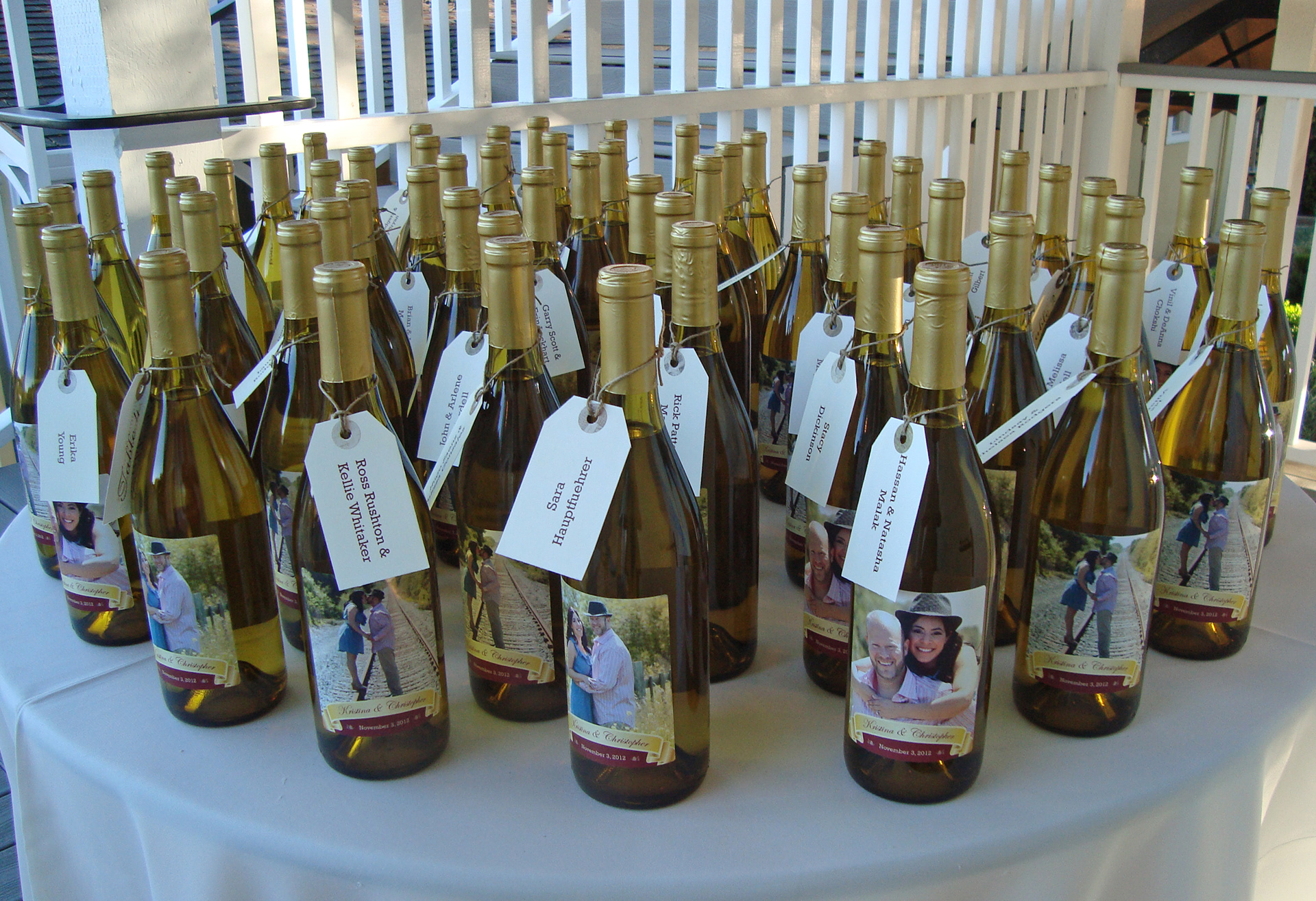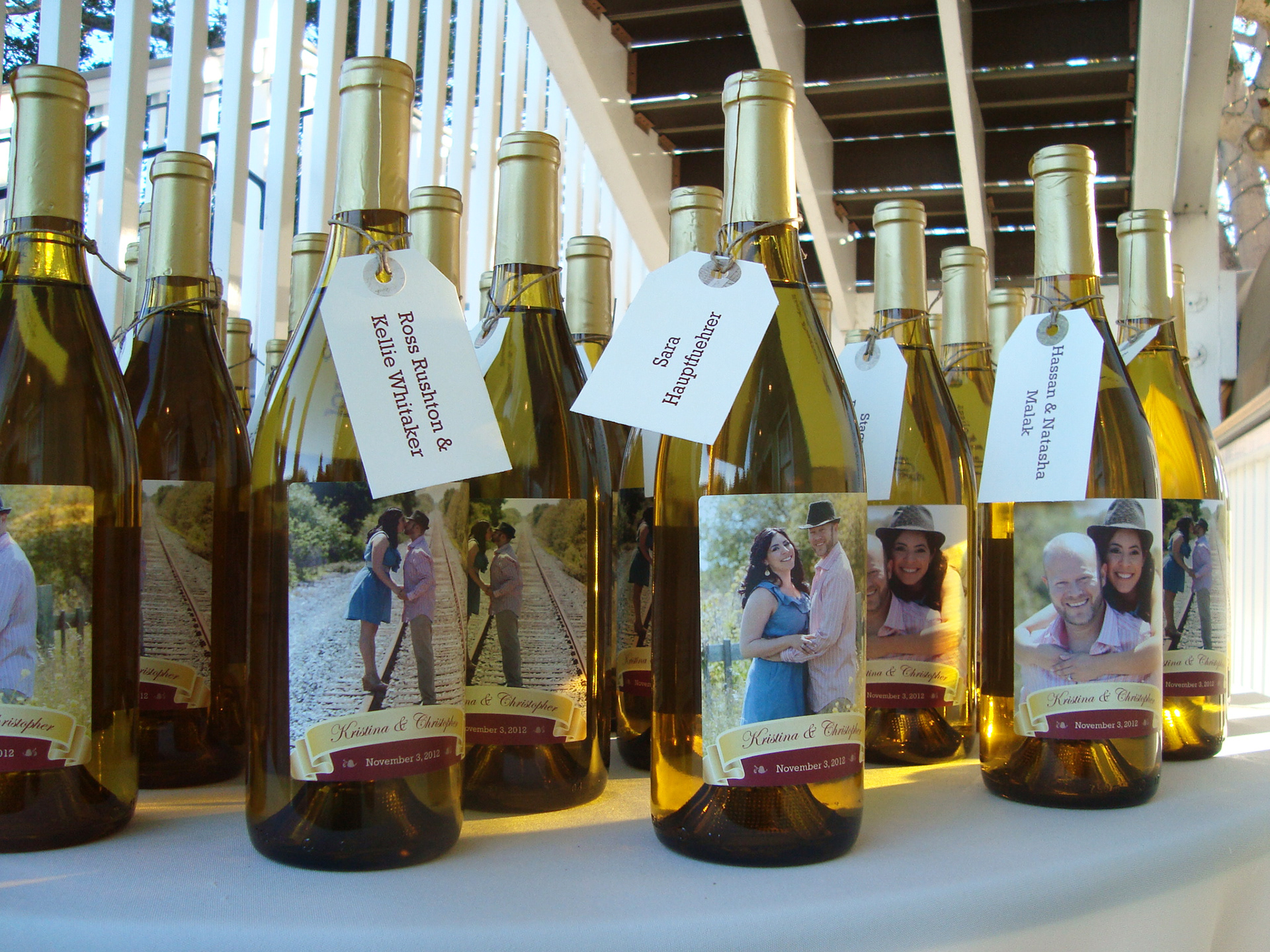 Print collateral for the Rodgers wedding, design items included a save the date magnet, front and back wine bottle labels and guest name tags.